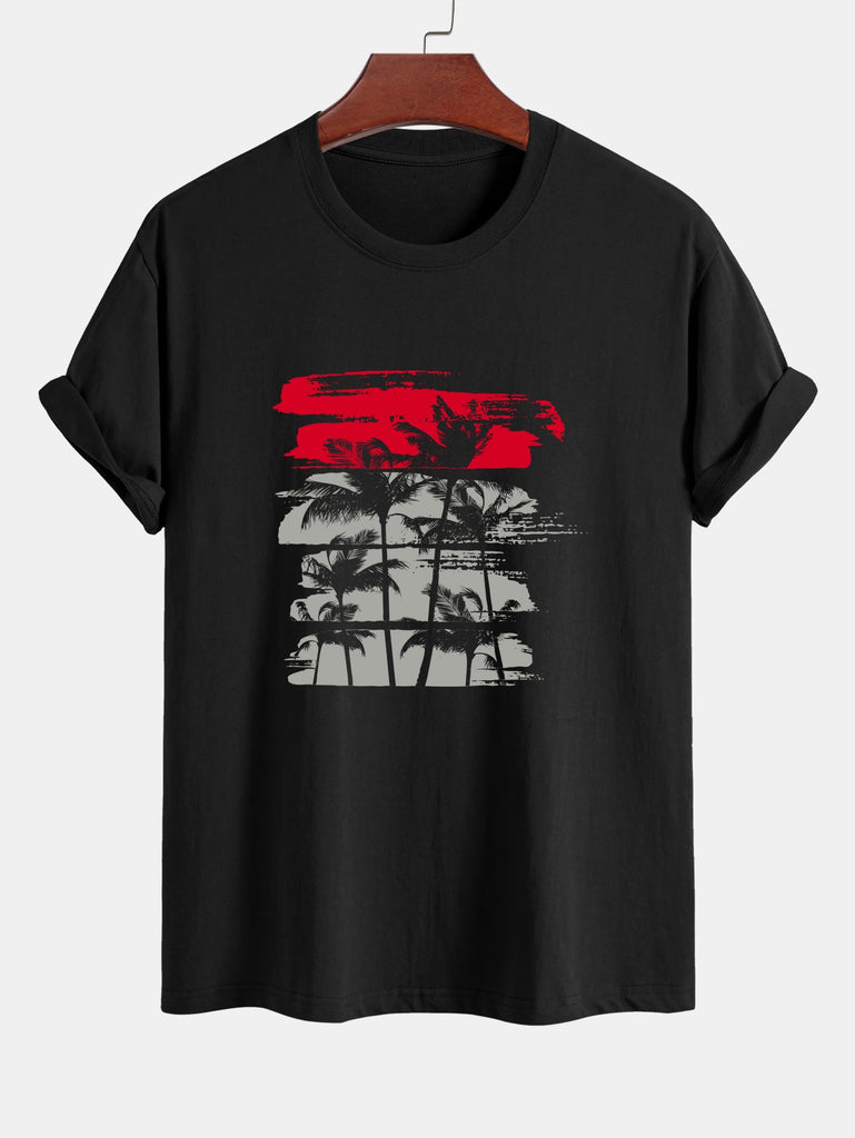 Palm Tree Silhouette Print Cotton T-Shirt & Solid Drawstring Swim Shorts