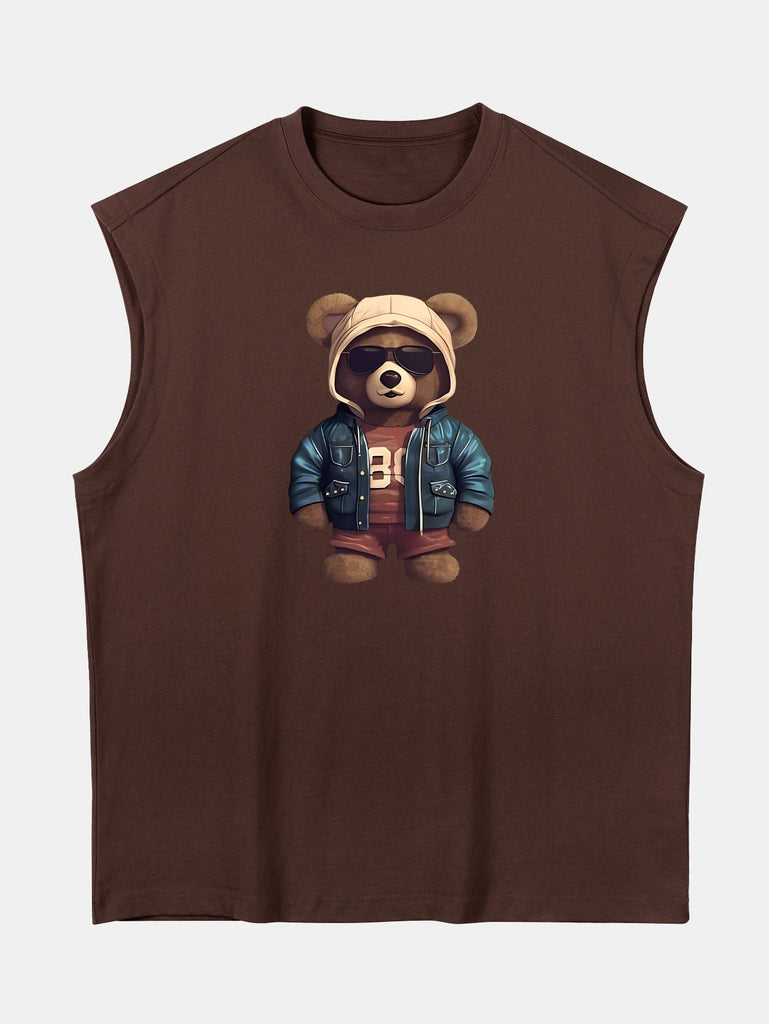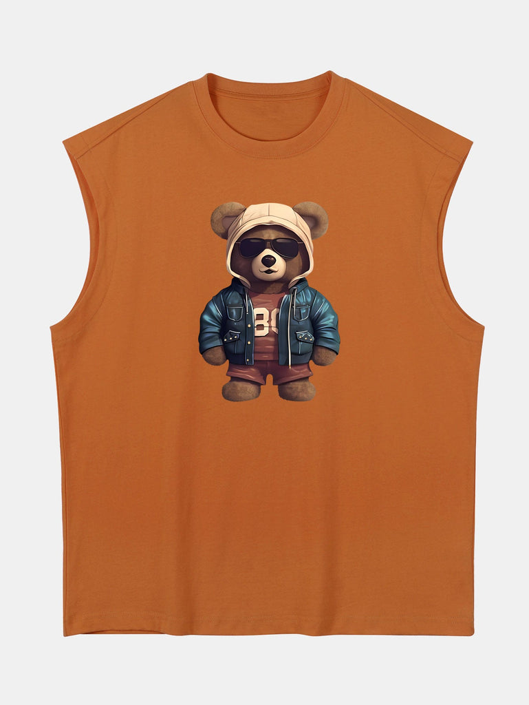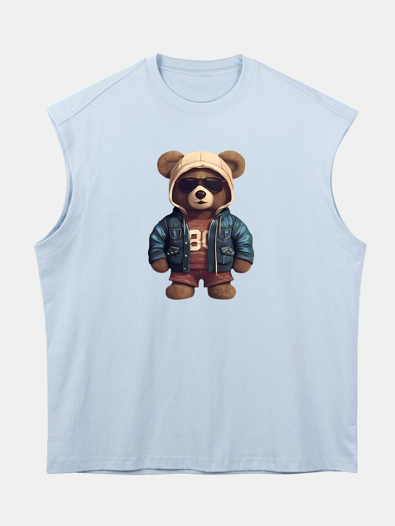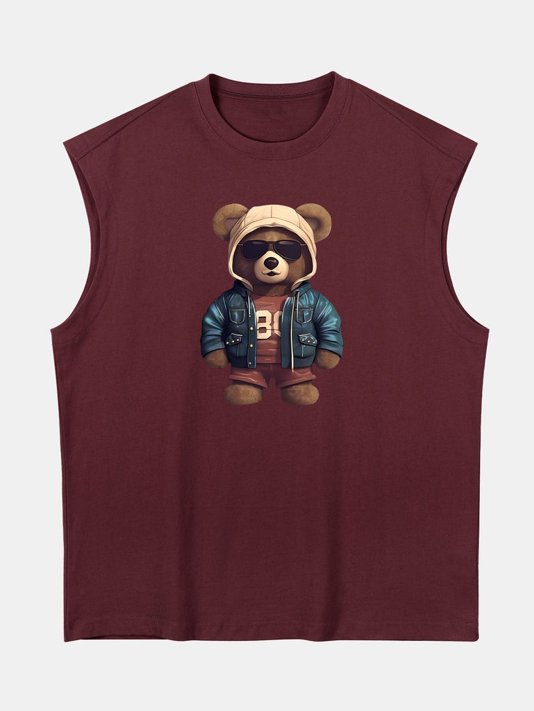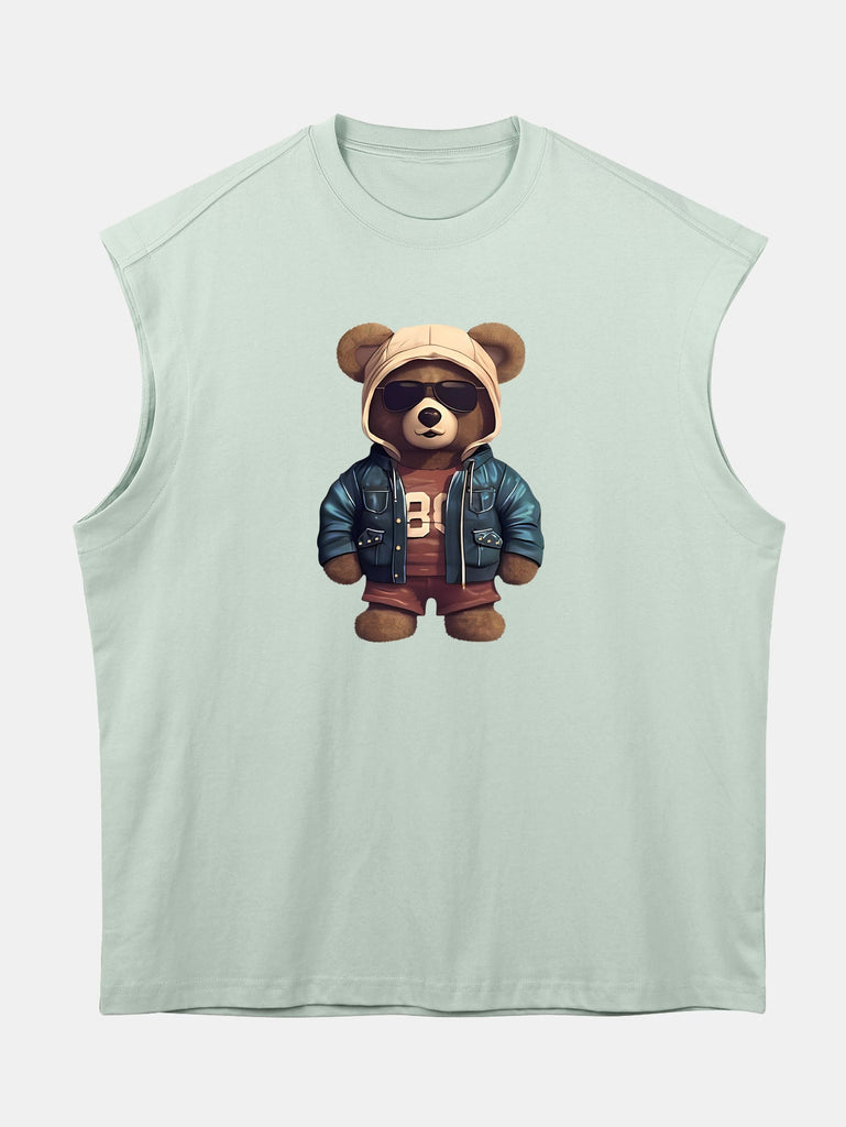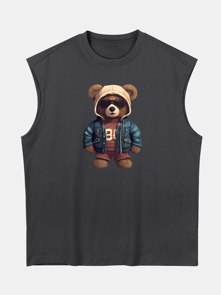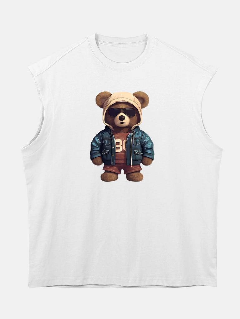 Relax Fit Bear In Leather Jacket Print Cotton Drop Shoulder Sleeveless T-Shirt