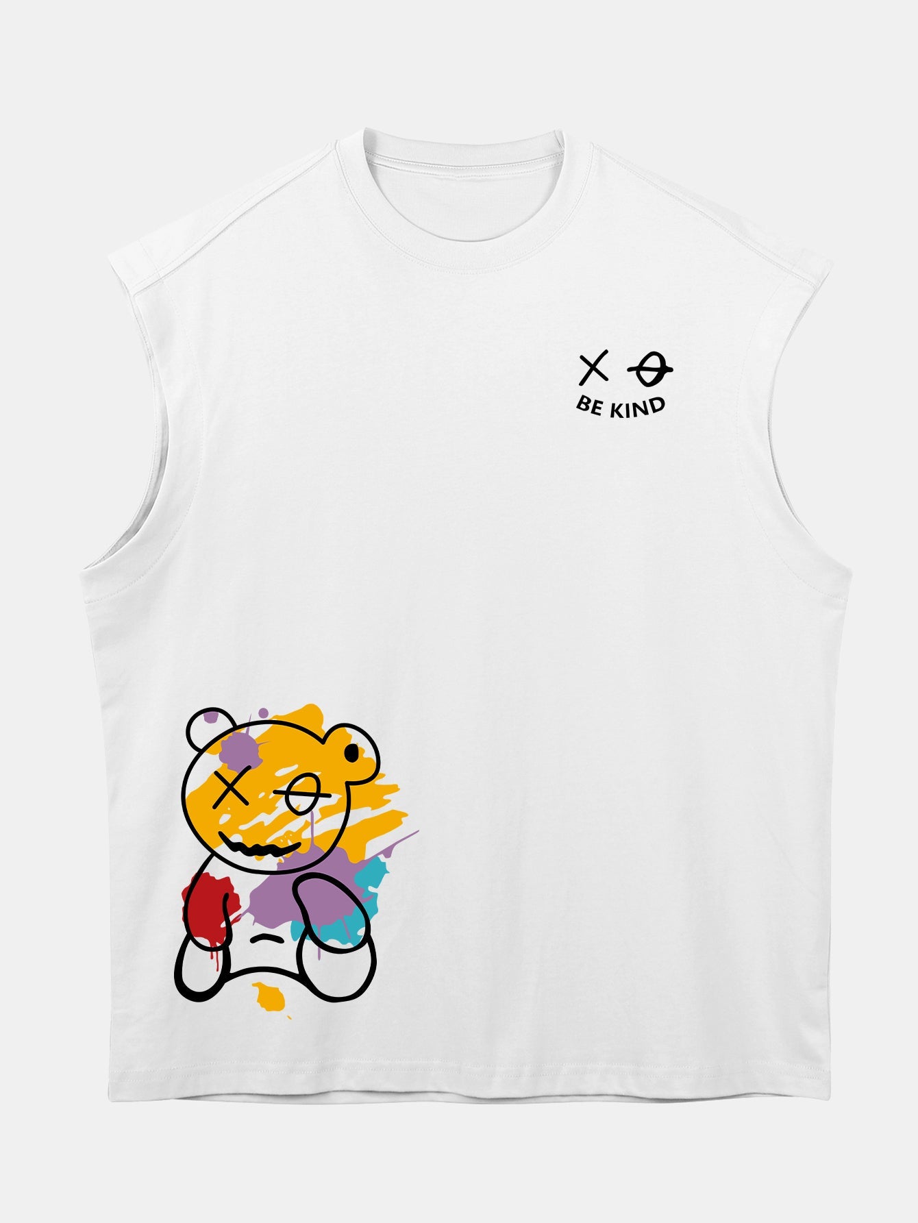 Make a statement with this bold and playful sleeveless T-shirt. Featuring a vibrant graffiti-style bear print, this relaxed-fit piece blends street art energy with casual comfort. Crafted from soft, breathable cotton with drop shoulders and an oversized cut, it's perfect for creating standout everyday looks.