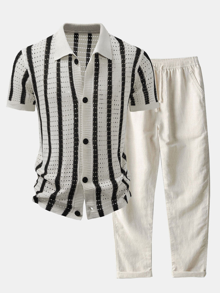 Stripe Eyelet Knitted Shirt & Straight Leg Linen Pants