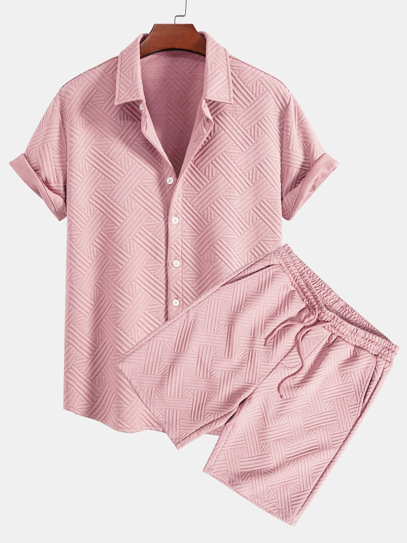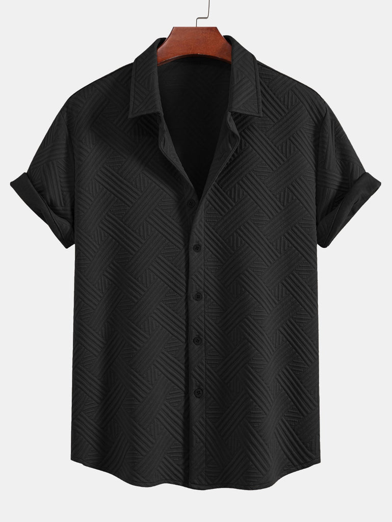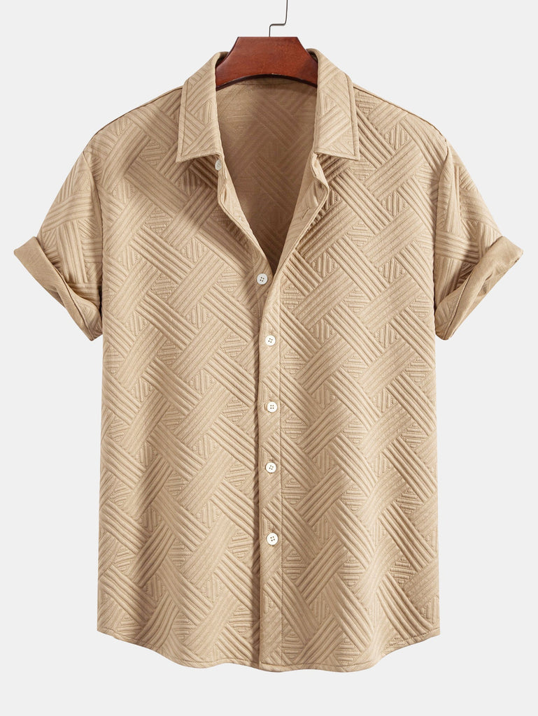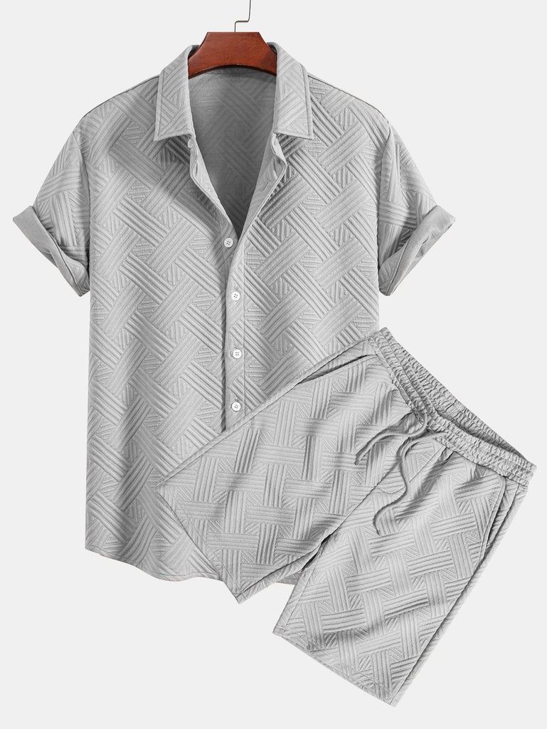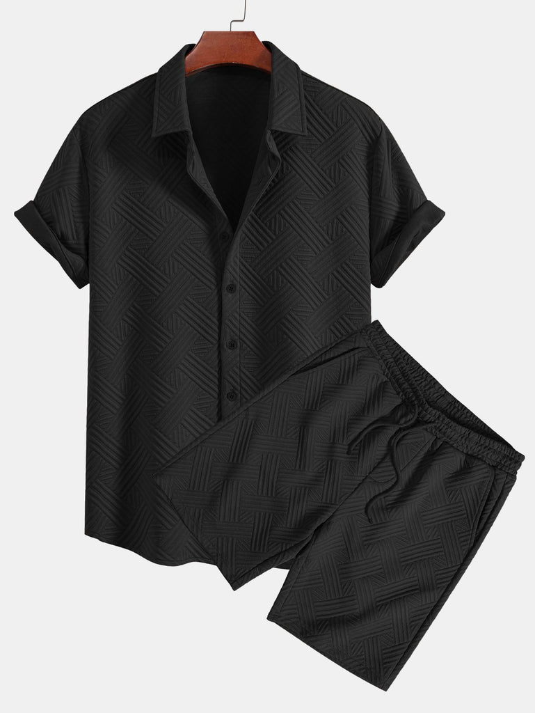 Refresh your summer wardrobe with this stylish two-piece set featuring a rhombus geometric jacquard texture. The button-up shirt offers a relaxed fit and turned-up sleeves for a casual, refined look, while the matching drawstring shorts provide comfort and versatility. Perfect for beach getaways, weekend lounging, or sunny-day strolls.