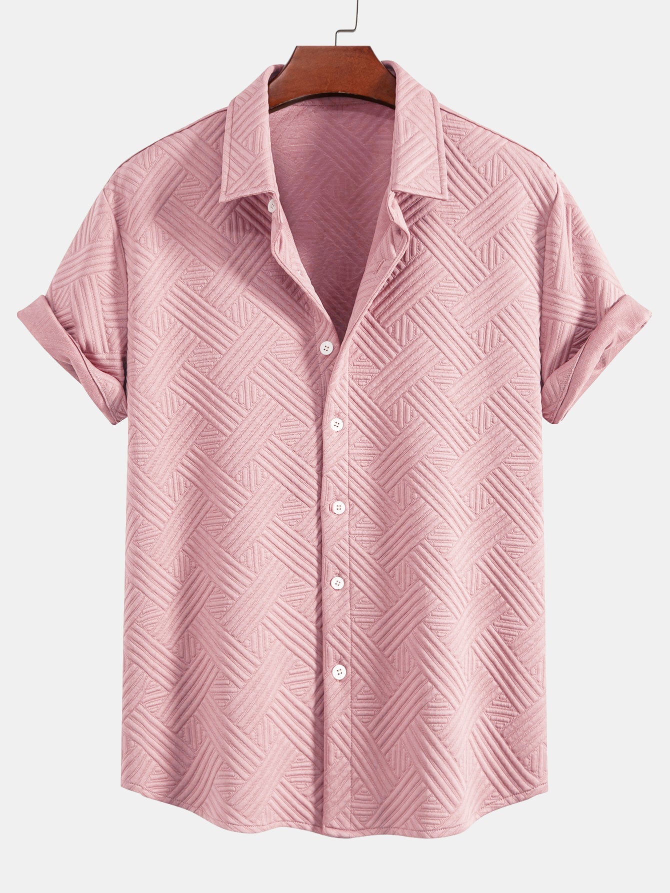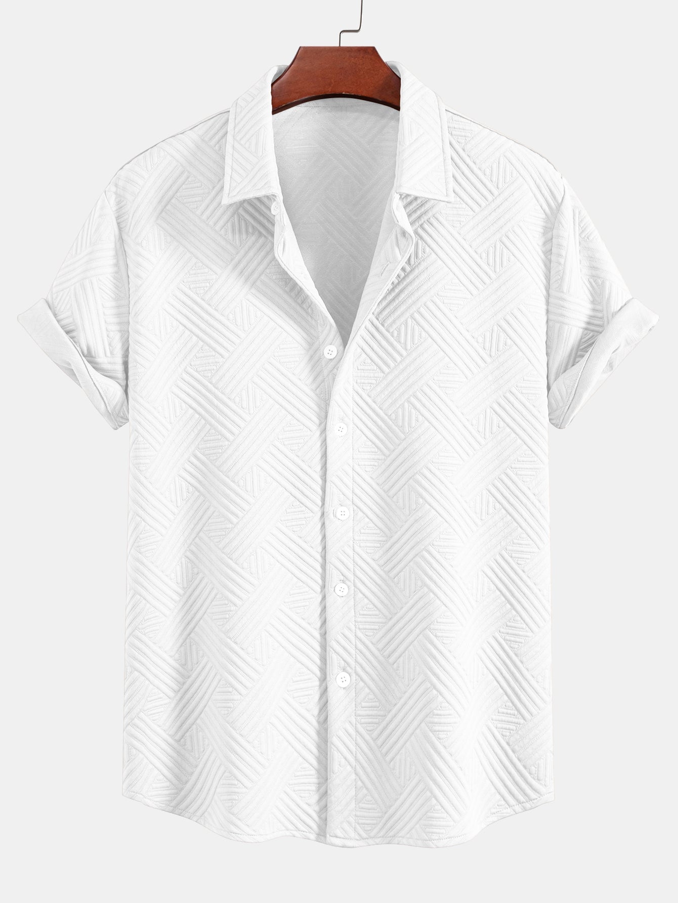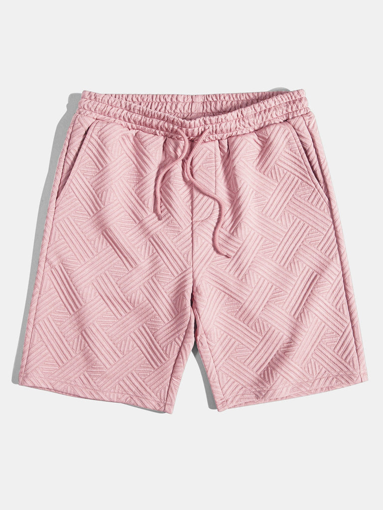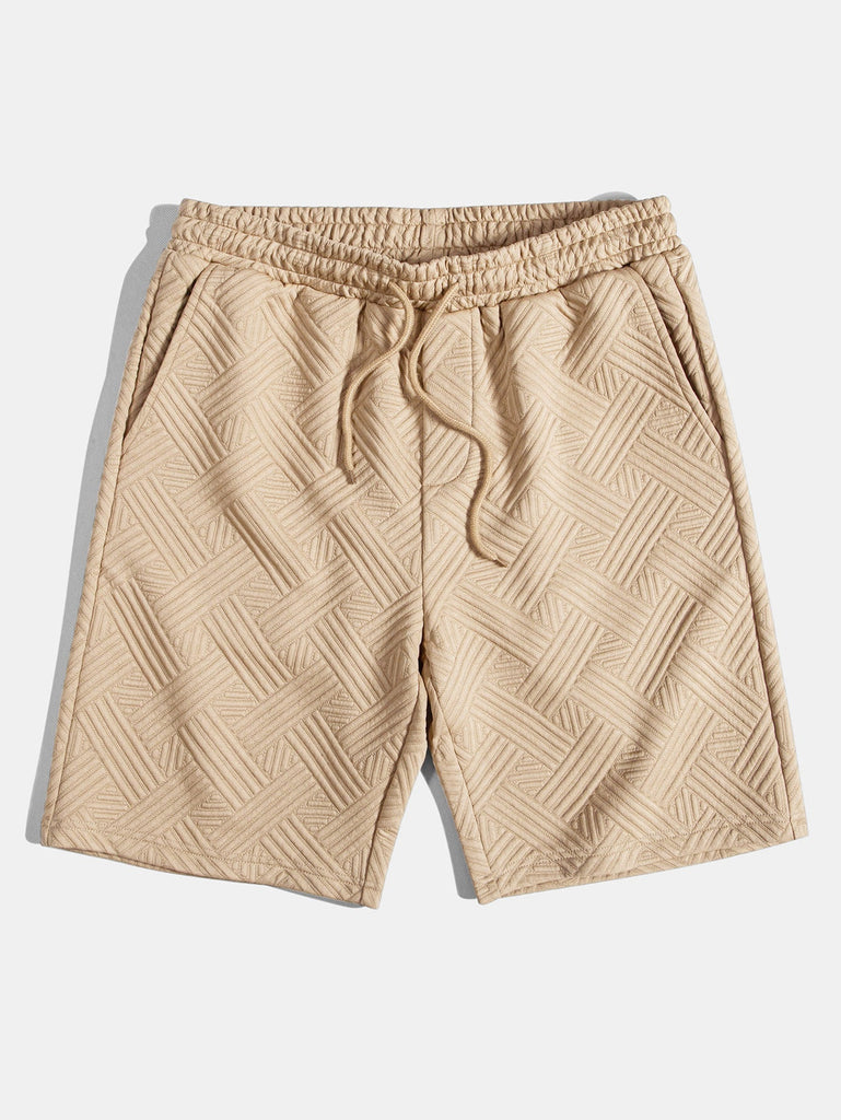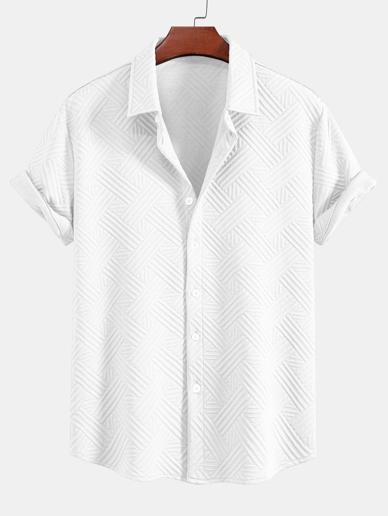 Refresh your summer wardrobe with this stylish two-piece set featuring a rhombus geometric jacquard texture. The button-up shirt offers a relaxed fit and turned-up sleeves for a casual, refined look, while the matching drawstring shorts provide comfort and versatility. Perfect for beach getaways, weekend lounging, or sunny-day strolls.