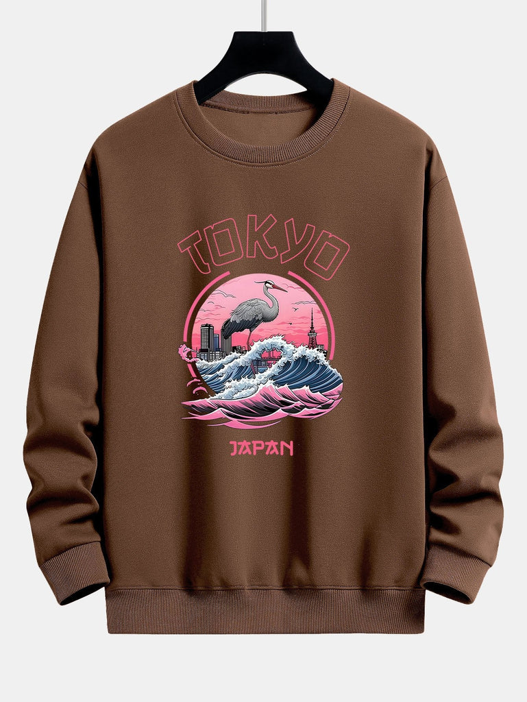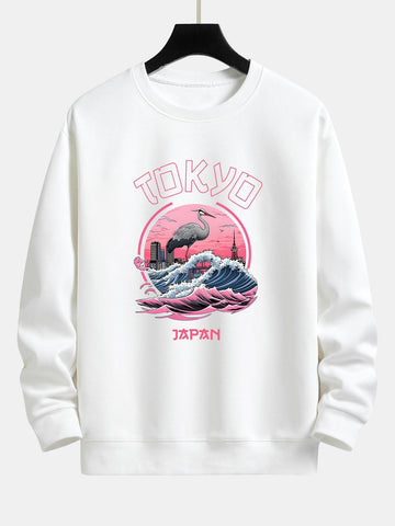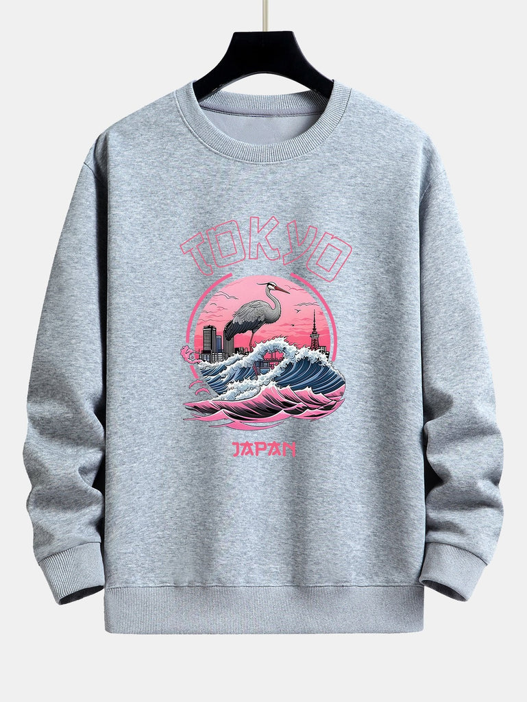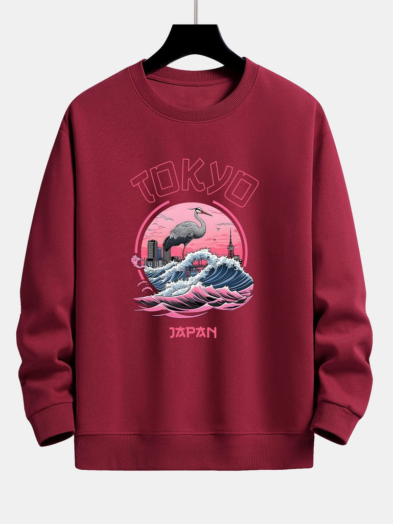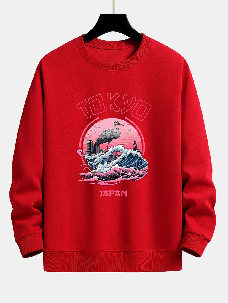 Tokyo Wave Crane Bird Print Relax Fit Sweatshirt