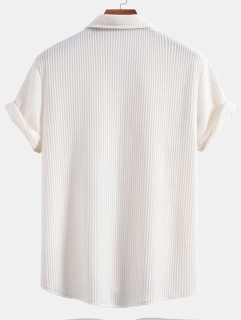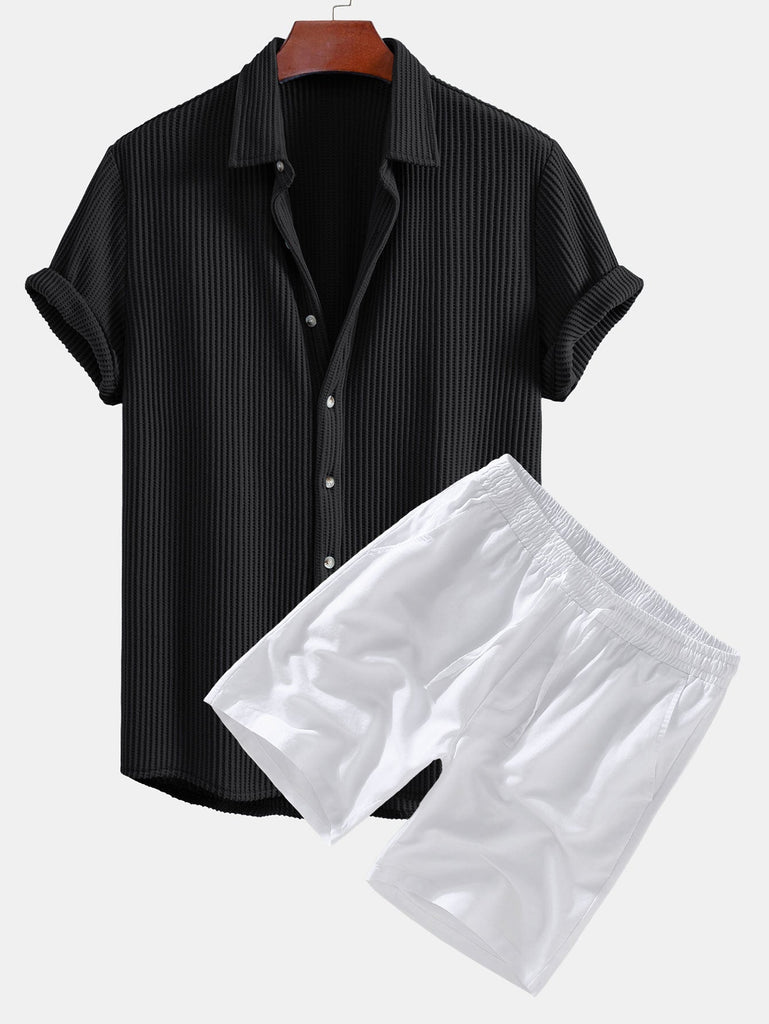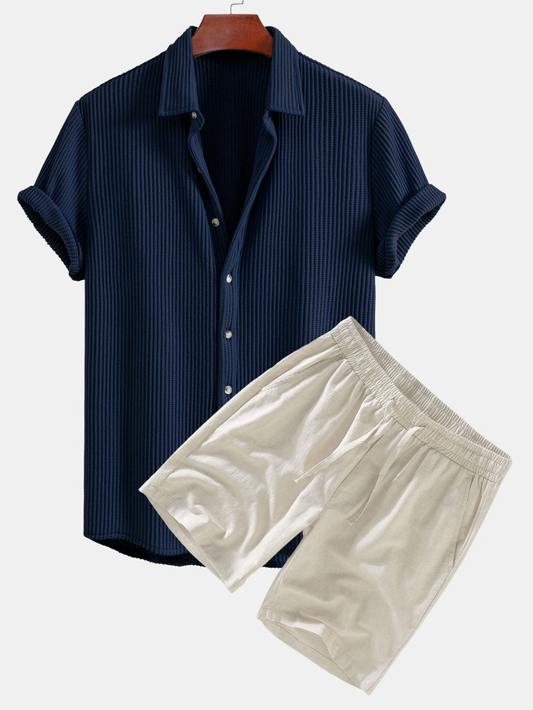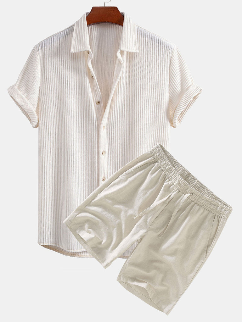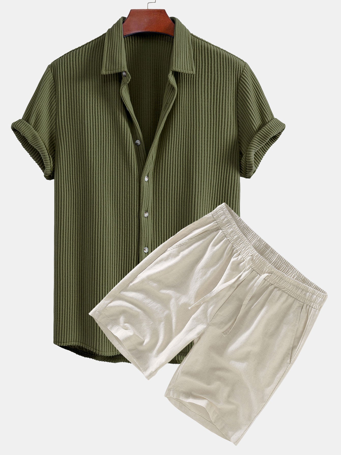 Waffle Button Up Shirt & Linen Cotton Blend Drawstring Shorts