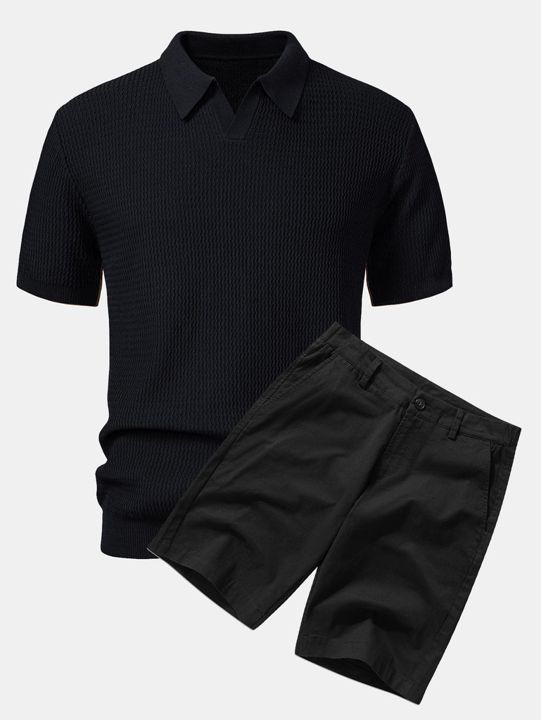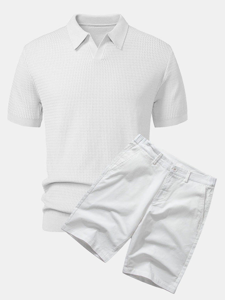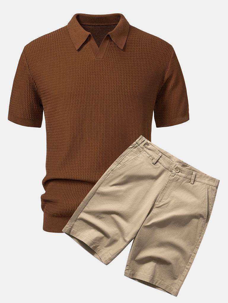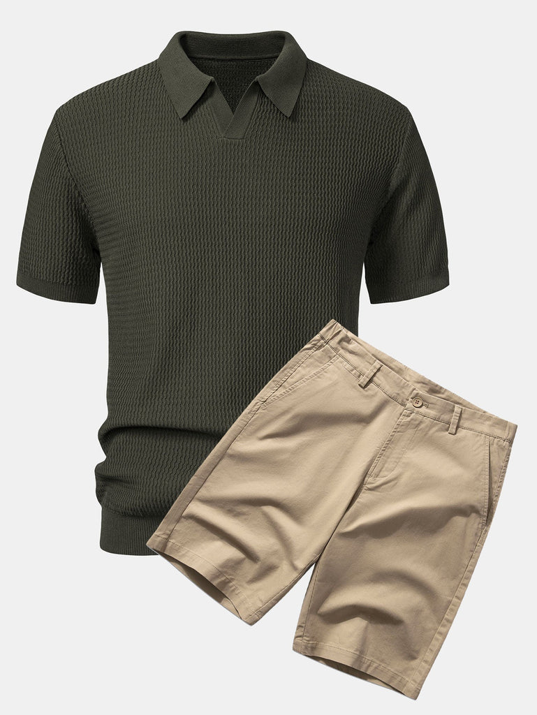 Wave Jacquard Knit V Neck Polo Shirt & Cotton Chino Shorts